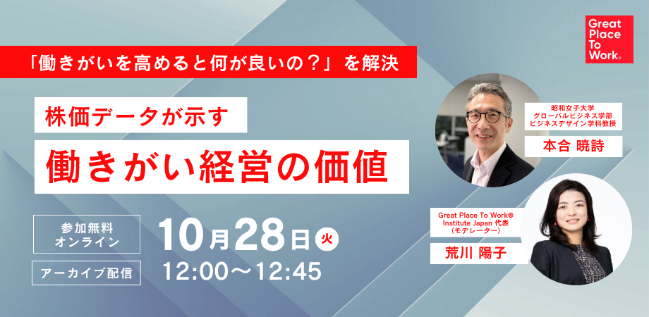 内容 | 「“働きがい”への投資は、本当に企業価値を高めるのか?」 経営者として知っておくべき、最新の研究結果をお届けします。 本セミナーでは、昭和女子大学の本合暁詩教授が「働きがいのある会社」として選出された企業の 株価パフォーマンスの分析結果を解説。 働きがい経営が企業の財務的価値にどのようなインパクトを与えるのかを、データで明らかにします。 人的資本経営が注目される今、 「働きがい」は理念や風土の問題にとどまらず、企業価値向上のための戦略投資として再定義されています。 本セミナーでは、経営の意思決定に役立つエビデンスと実践のヒントをお届けします。 <配信形式について> 本セミナーは、事前に収録した内容を指定日時に放映するアーカイブ配信です。 当日のリアルタイム登壇や質疑応答はありませんが、 視聴後のアンケートでご質問をお寄せいただくと、後日講師・運営より回答をお送りします。 ライブ同様の臨場感とともに、双方向で学べる機会としてご活用ください。 <プログラム> 12:00-12:05 オープニング・講師紹介 12:05-12:20 本合暁詩教授メイン講演「働きがいのある会社の株価分析」 12:20-12:35 本合暁詩教授 × GPTW Japan荒川 対談「働きがいが生む事業価値」 12:35-12:45 質疑応答(収録内容) <こんな方におすすめ> ● 働きがいを経営戦略の観点で捉えたい人事・経営者 ● 財務指標と従業員エンゲージメントの関係に関心がある方 ● 人的資本経営を実効的に進めたい経営層・経営企画責任者 ▼Great Place To Work®について Great Place To Work® は世界170ヵ国、年間21,000社以上の調査を行う「働きがいのある会社づくりの世界的な専門機関」です。日本国内においても年間600社以上の調査を実施し、日本における「働きがいのある会社」の普及と実現のための支援活動を行っています。 |